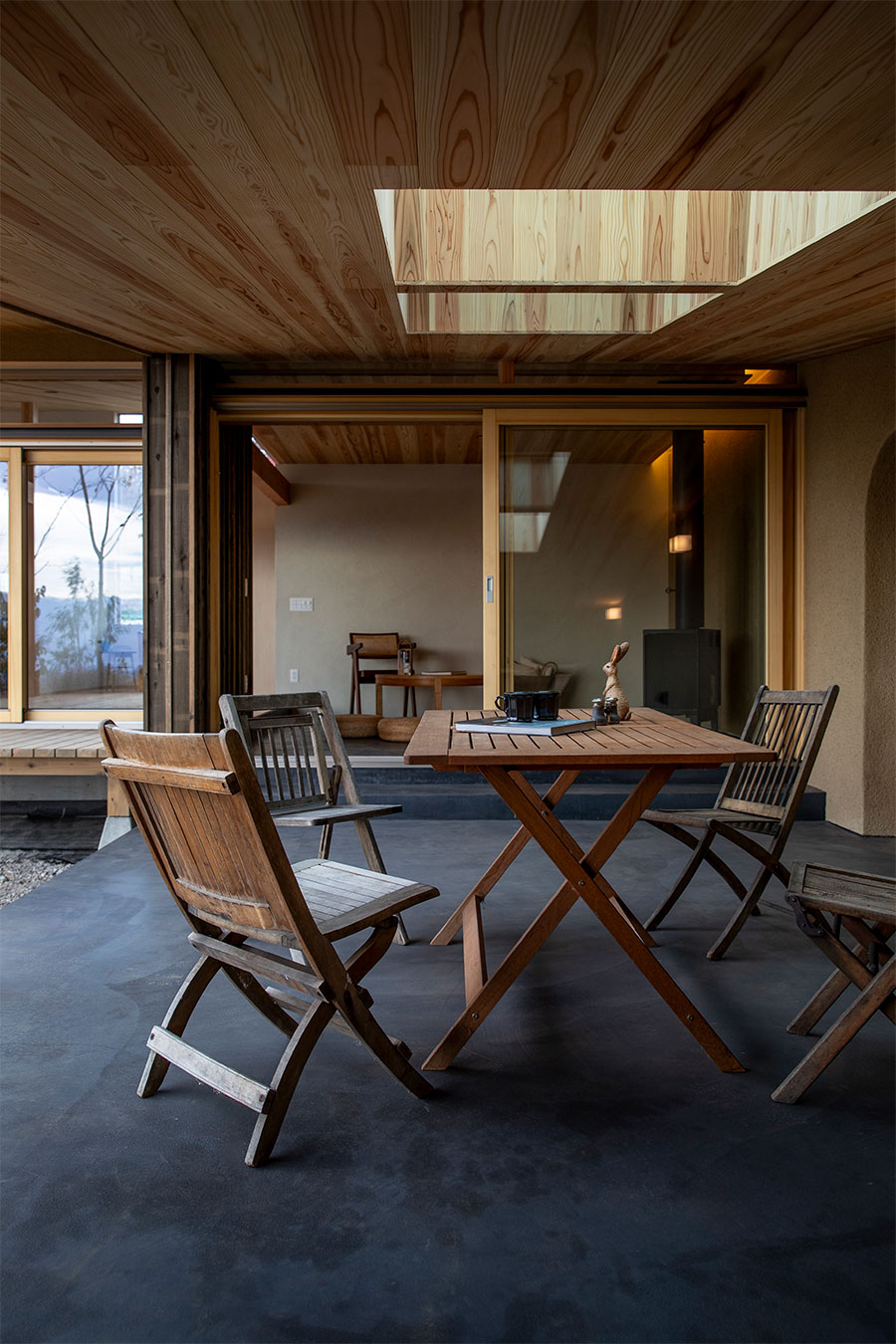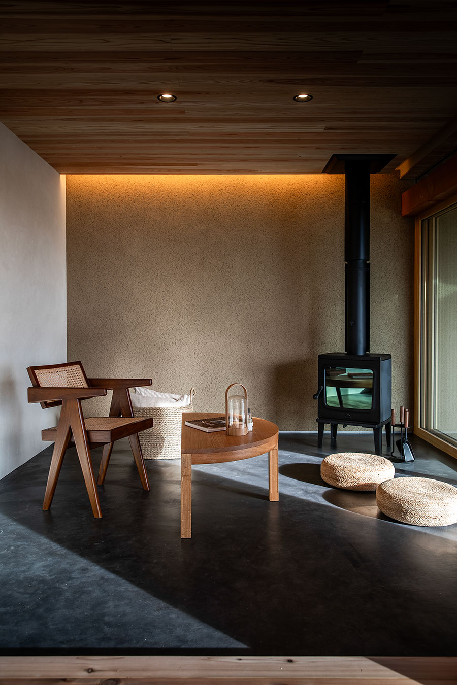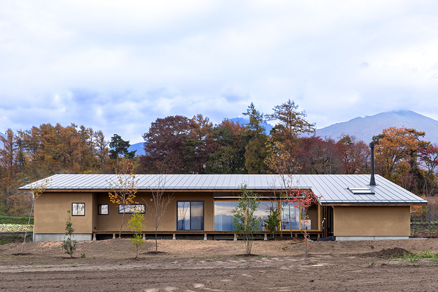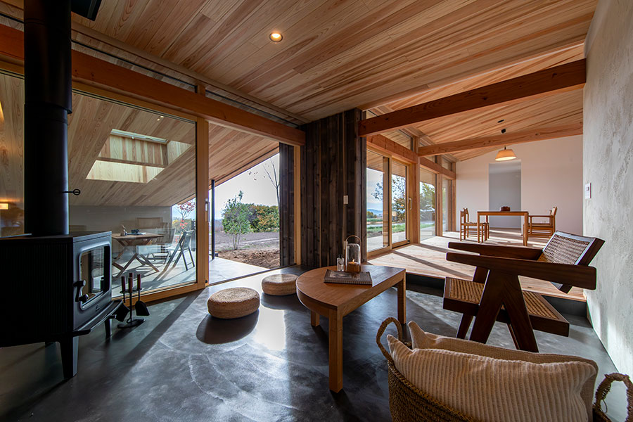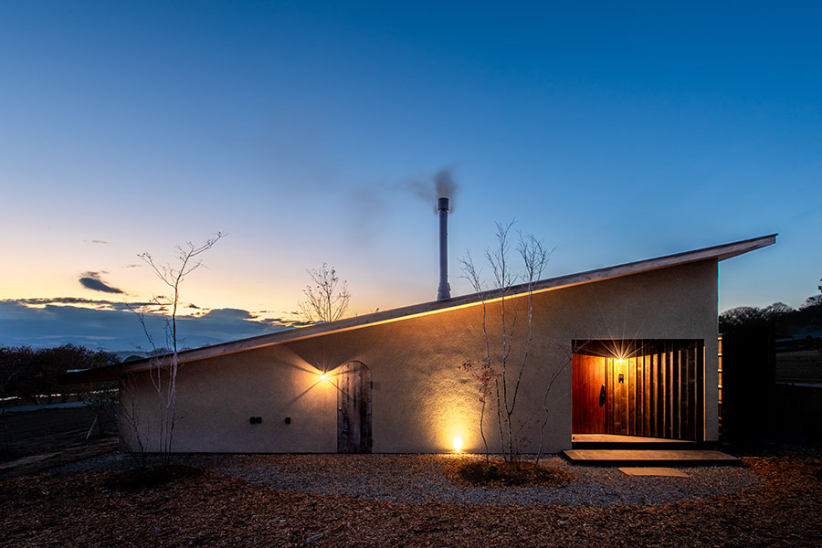 AARDEとは「土」。人は、原初の素材の一つである土と、縄文の頃から共に生きてきた。土にうずくまるように。土に抱かれるように。遺伝子レベルで私たちに刻まれたその「土間」への敬慕とも言える感情に、AARDEは応える。どこか大地へ還っていくような、特徴的なプロポーションの外観。黒モルタルで仕上げられた内部の土間。AARDEに住んで、土間に薪ストーブを置いて、夜の帳の下で火を焚いてみて欲しい。原初の「火の間」が、あなたの遺伝子を震わす情景を立ち上げてくれる。