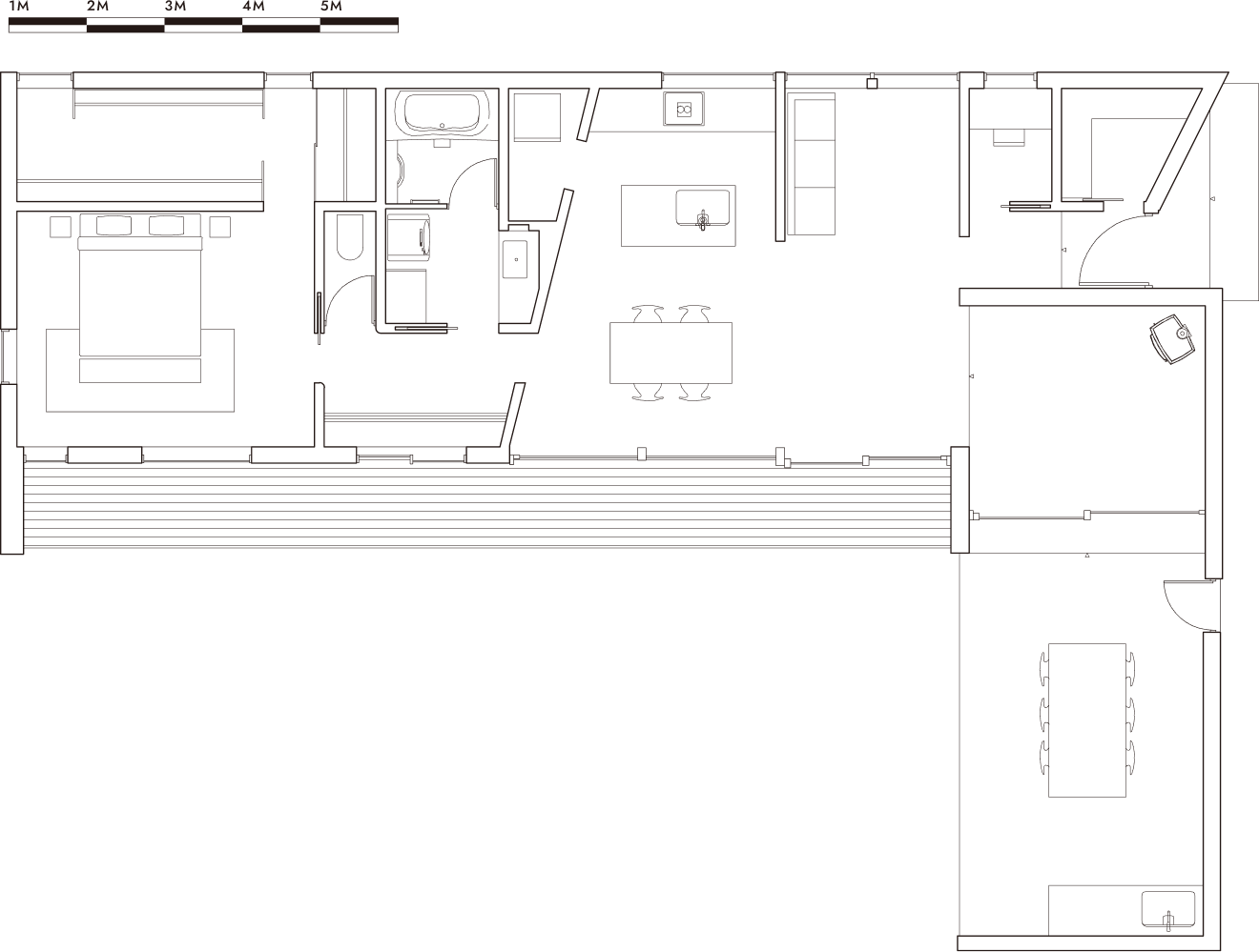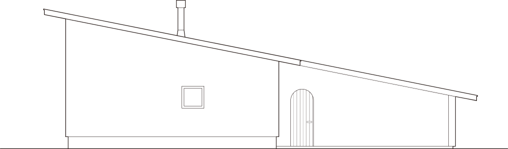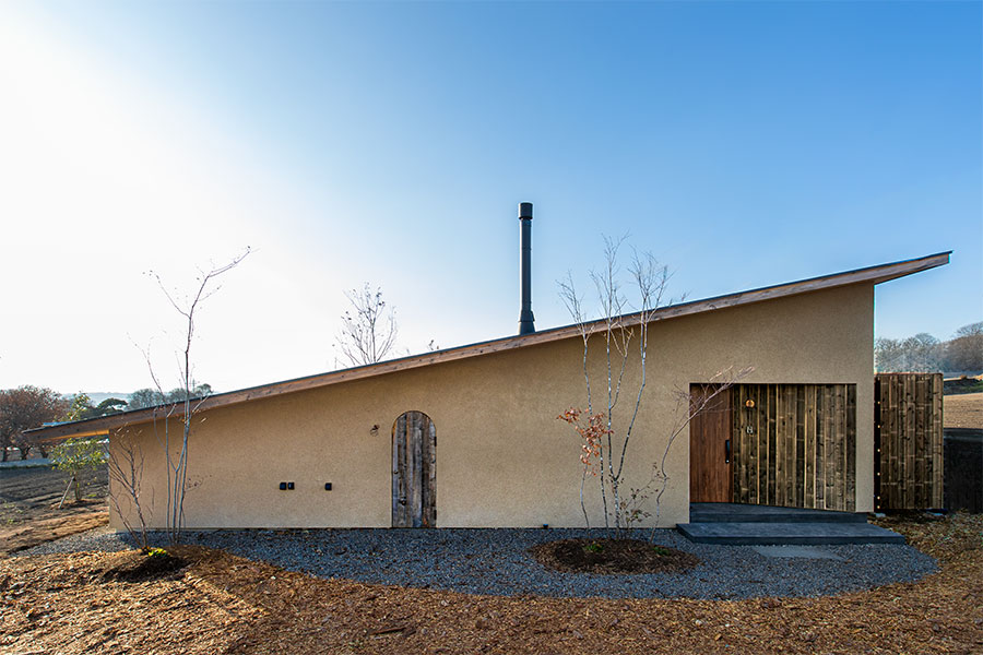 土間仕上げの「火の間」と「エクステリア・ダイニングスペース」を携えた、1LDKのラグジュアリープラン。短手では緩やかな勾配の長屋根がAARDE特有の美しいプロポーションを生み、左官仕上げの外壁に穿たれたアールの木製扉が可愛らしさのアクセントとなっている。絵本の様な扉の向こうには、エクステリア・ダイニングスペース、庭、長手の縁側がまるで別世界の様に拡がっている。長手のプランをスライスするように引かれた対角線は、この特別な外空間とLDKを強く結びつける為の重要な意匠となっている。※規格住宅ではありません