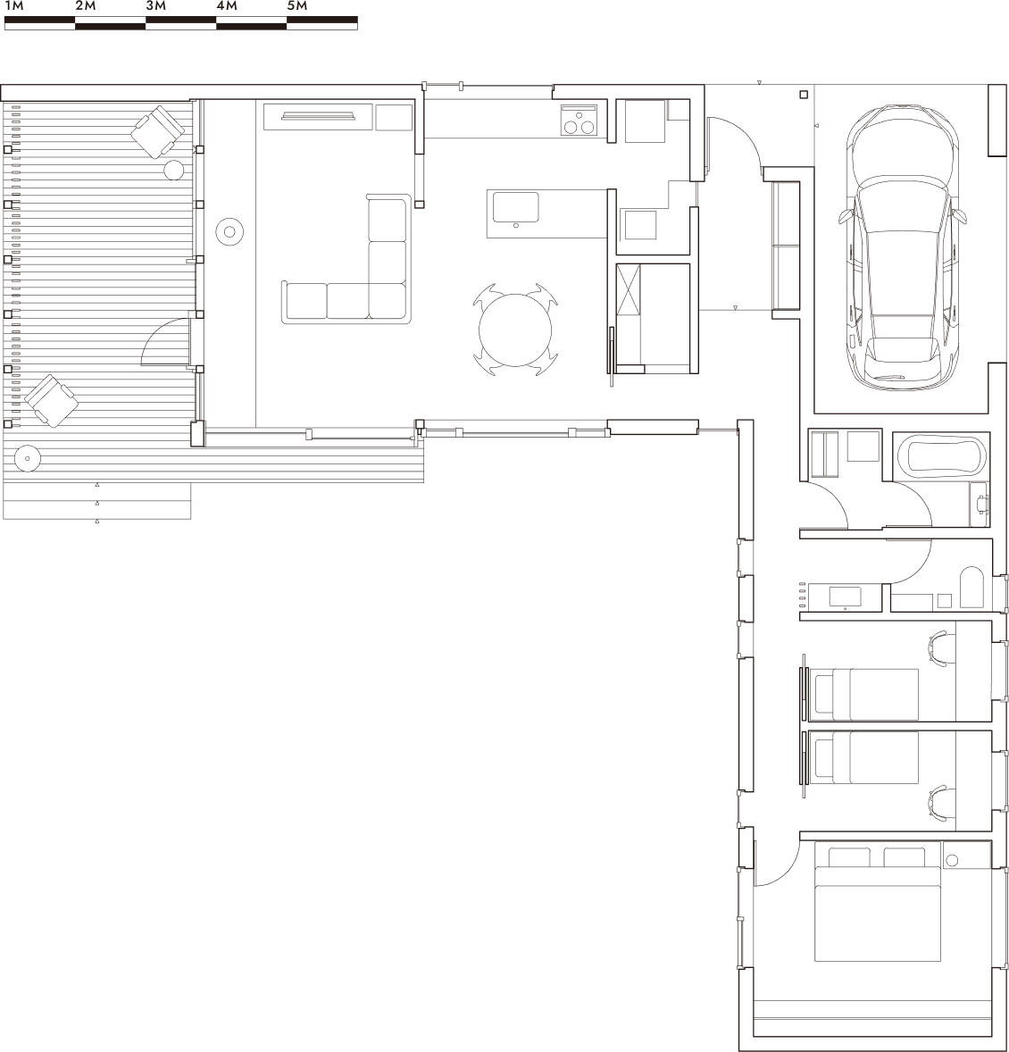 インナーガレージ付きL字型3LDKプラン。LDKと寝室棟に分かれたL字の躯体が、庭先を優しく抱き込む。LDKからは大型ガラス面を通してデッキが広がる。デッキは屋根とルーバー壁によって風雨と視線から守られ、四季を通して自然と家族を繋ぐ「安らぎの場」を生み出している。LDK棟から離れた主寝室は、緑茂る庭と、そこに平行するLDK棟の美しいプロポーションを臨む。※規格住宅ではありません